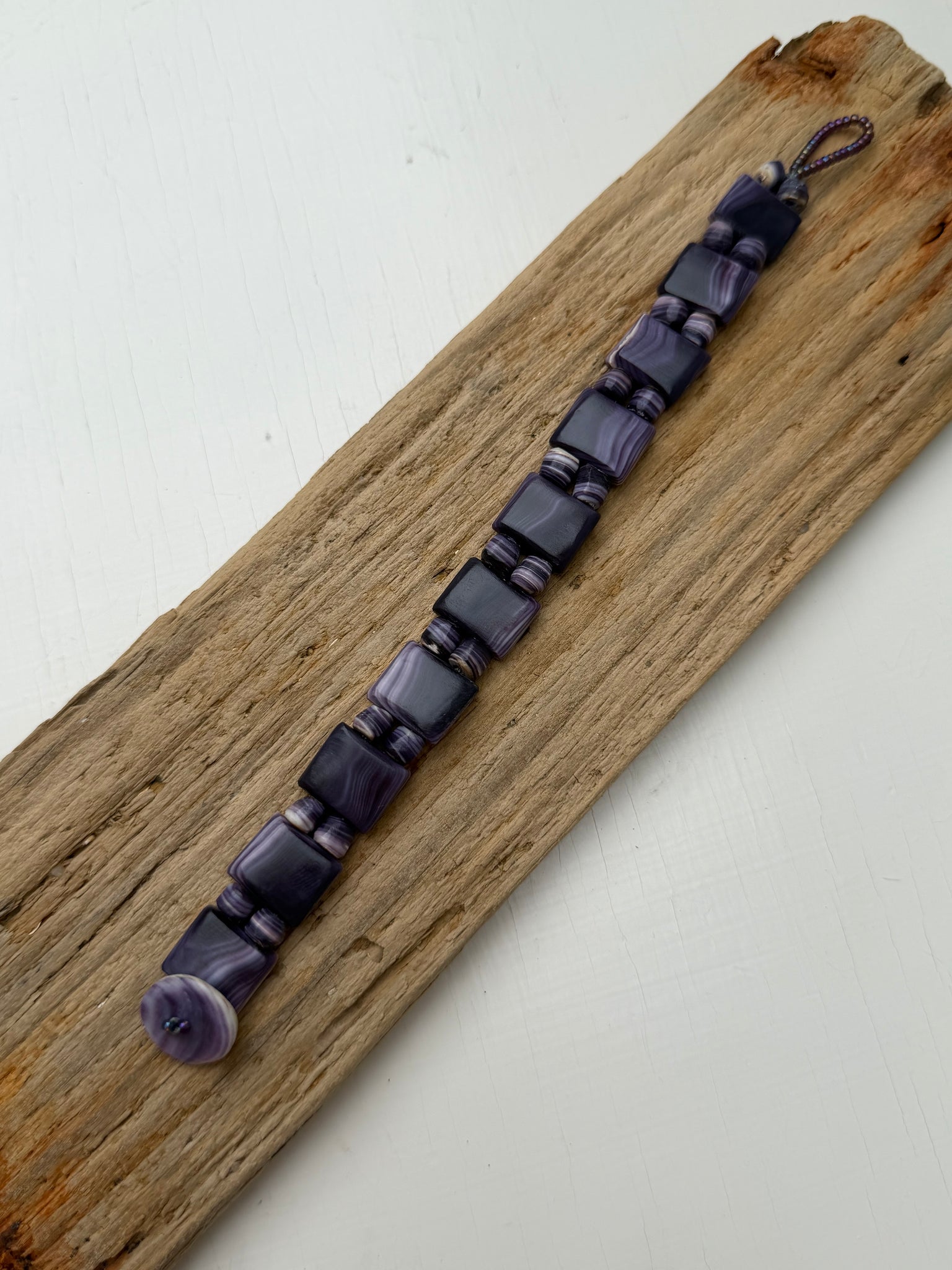 10 classic size tiles double drilled with two tiny softened squat beads in between each tile. Double strung on 50lb braid finished with a round quahog clasp