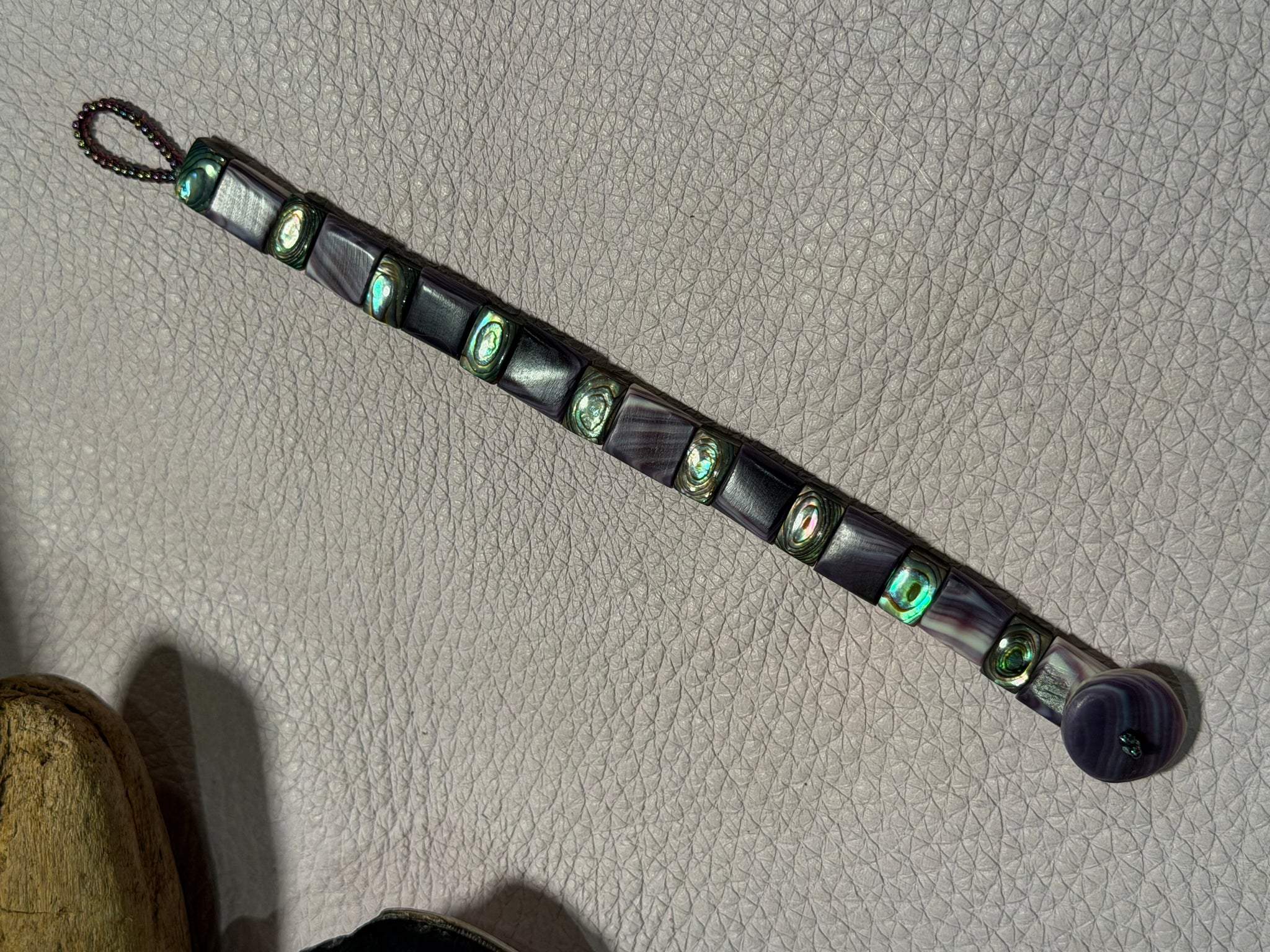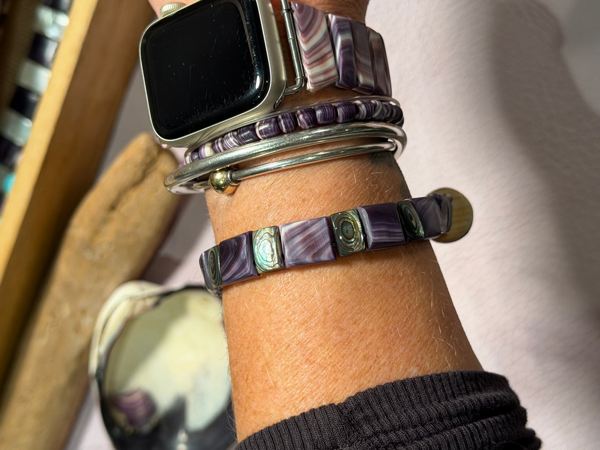 The miniature version of the classic abalone and wampum tile bracelet. 10 double drilled wampum tiles and 10 double drilled abalone tiles double strung on 50lb braid finished with a round wampum clasp.