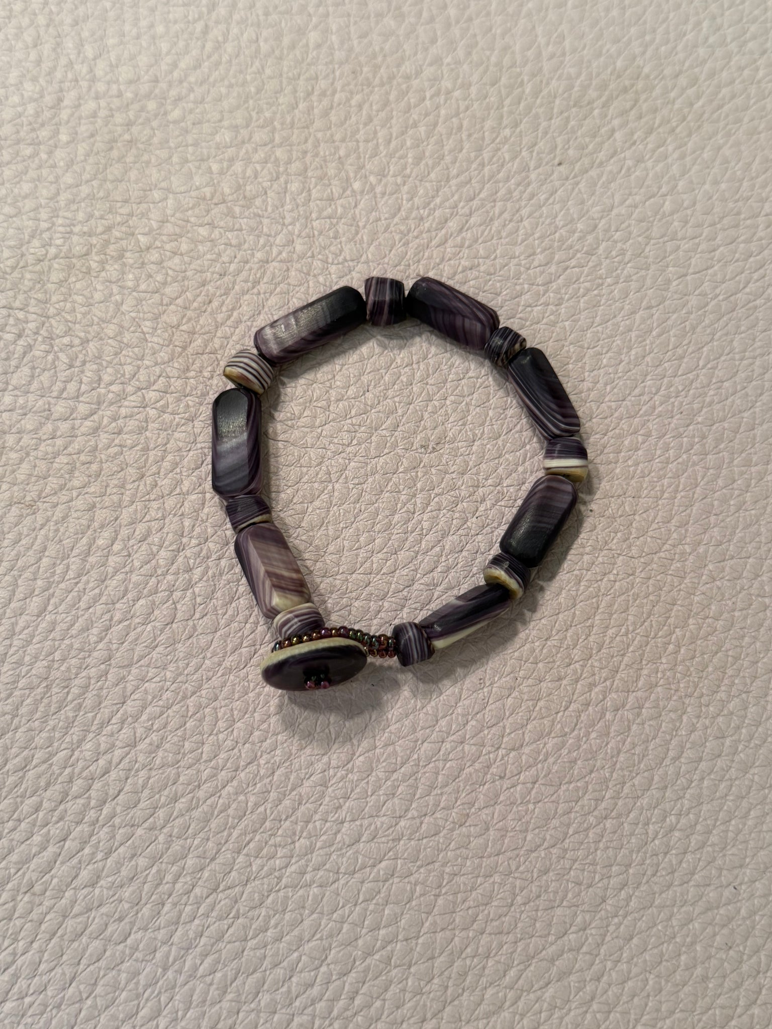 7 rectangles tubes with soften square beads in between. Double strong on 50 pound braid finished with the round Wampum clasp